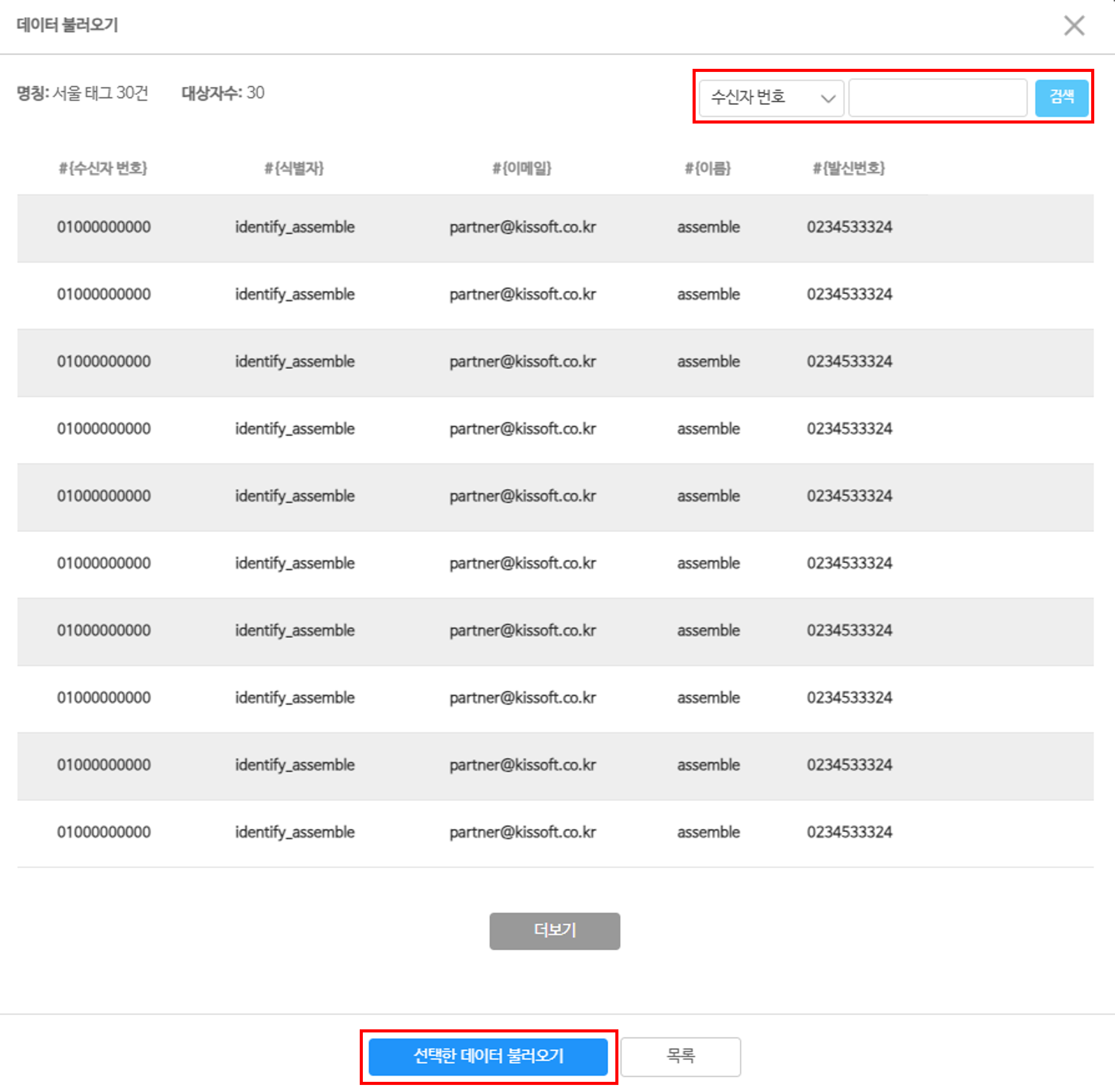 ①    고정 헤더(수신자 번호, 식별자, 이메일, 이름) 항목 검색 가능